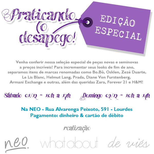 A edição especial do Praticando o Desapego! está chegando, já é neste fim de semana! Desta vez teremos a participação de Carol Rache, do blog What About, e de Raquel Braga. As meninas disponibilizaram muitas peças bacanas de marcas finas, portanto aguardem bastante qualidade na seleção!